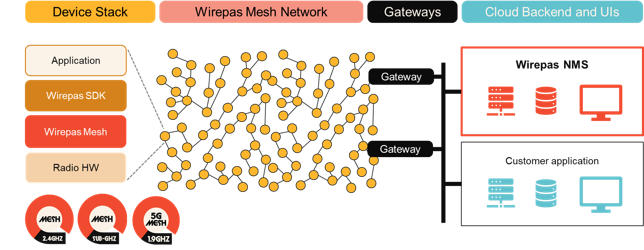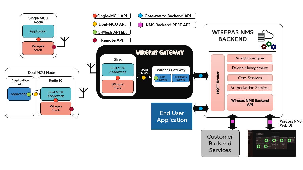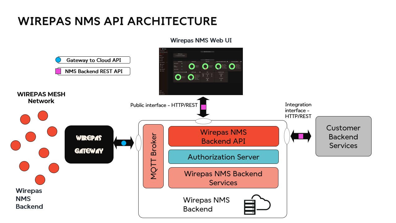 - Wirepas Backend Components API and UI: Wirepas NMS with its Web UI, powerful REST APIs and many other feature sets
