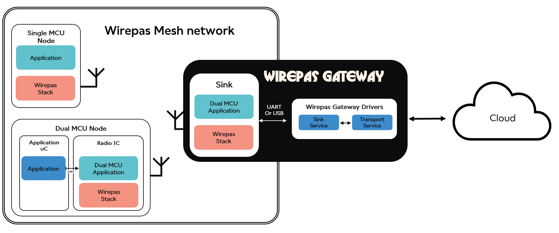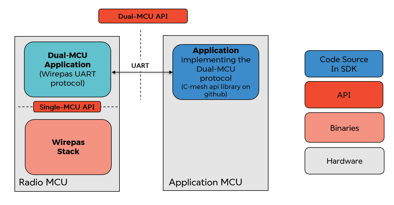 - Dual-MCU architecture: The Wirepas Mesh stack and the Dual-MCU application run in the Radio IC while the Application itself runs in another MCU. The Application communicates to the Radio subsystem using a UART or USB serial link. The Dual MCU application is typically also running inside the gateways (this will be covered later within this document).