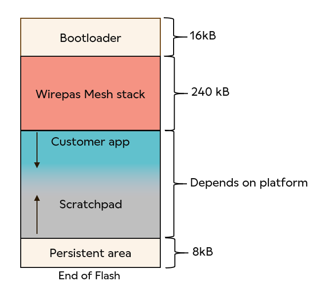 The mapping of the different areas is defined by Wirepas. The Customer application seats after the Wirepas Mesh stack. The available memory for the application depends on two things: