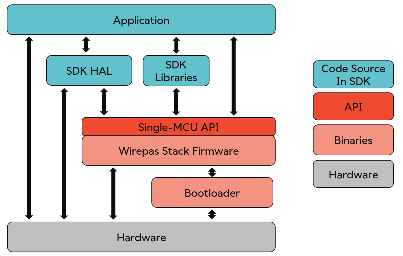 The Single-MCU API consists of libraries, each dedicated for a specific use, such as data handling or time services. The API is kept backward compatible. This enables an old application to operate with a newer stack firmware.