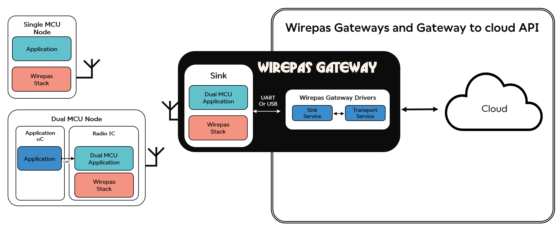 The Wirepas Gateway and associated API makes the link between the local Wirepas Mesh networks and the Wirepas backend. Wirepas provides a reference implementation of the Gateway allowing to control all Wirepas Mesh features from the backend. The Wirepas Gateway connects to a Sink over UART or USB. The Sink node implements the Wirepas Mesh stack and the Dual-MCU Application to communicate with the network.