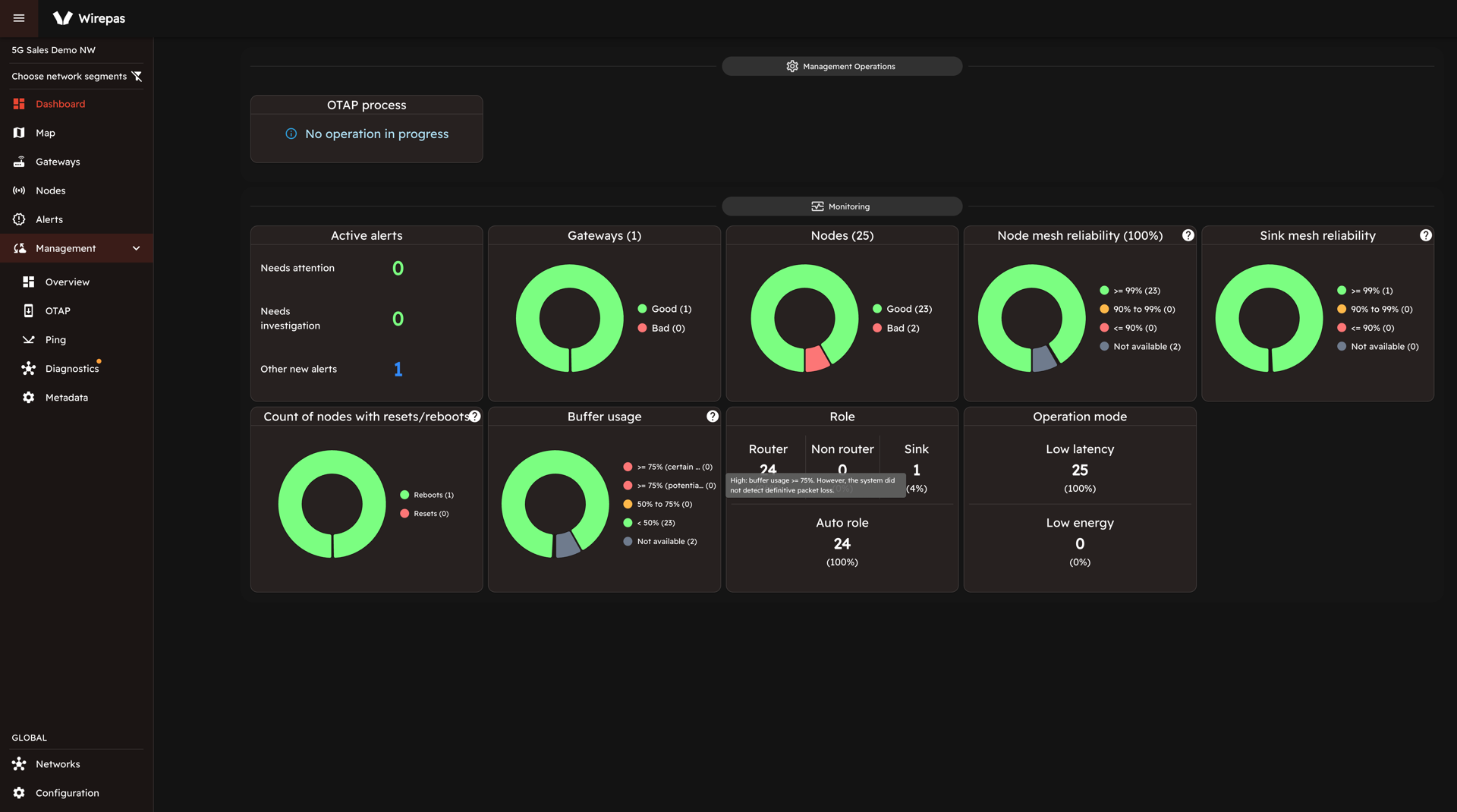 The modern web user interface [7] of NMS offers extensive management and monitoring features for Mesh administrators, operators, and end users. It provides Wirepas Mesh monitoring through contemporary time series views, tables, and an interactive world map. In addition to other Wirepas APIs, the NMS UI functions as an intuitive Wirepas Mesh management and control panel.