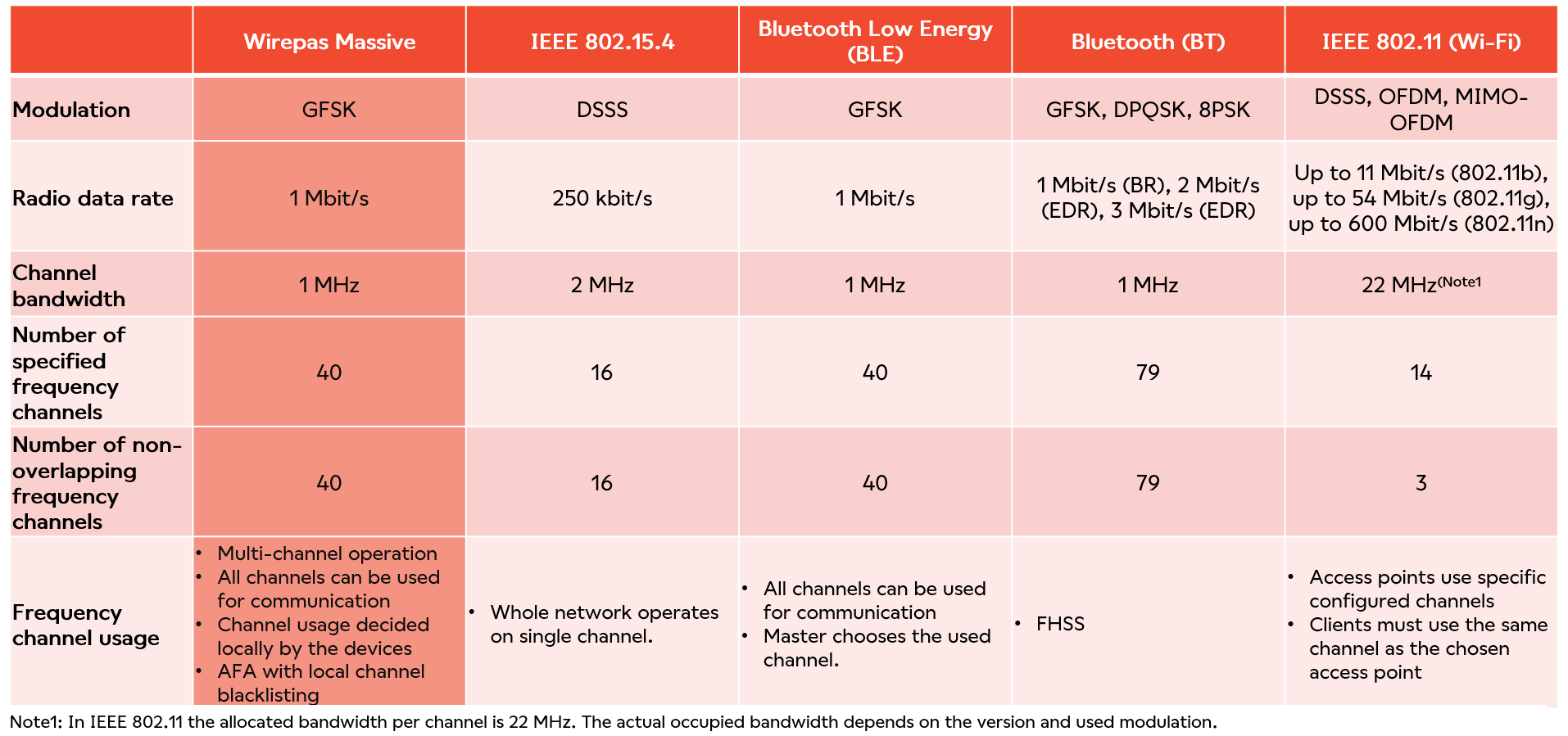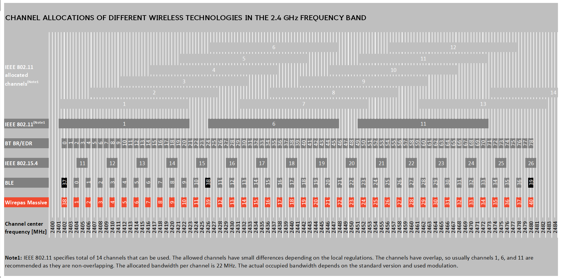The occupied bandwidth of Wirepas Mesh devices is small (~1 MHz in the 2.4 GHz ISM band). This minimizes collision probability with other wireless systems in frequency domain and leaves room for Wirepas Mesh devices to blacklist channels and still have enough usable channels for communication.